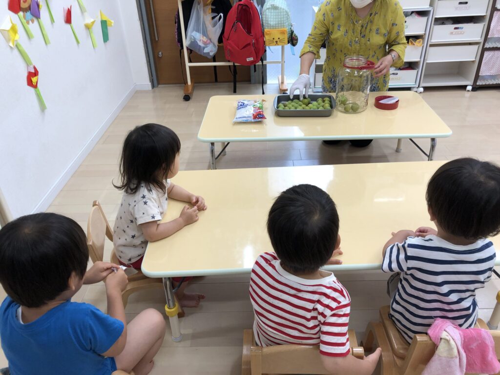 昨日の夕方、よつば体育幼児園(ブログ)のお友だちからお裾分けして頂いた梅で園長先生がジュースを、作ってくれたので、たいよう組さんは 園長先生をじーっと見つめて、美味しい梅ジュースになぁれ!と園長先生を応援しました(o^^o)