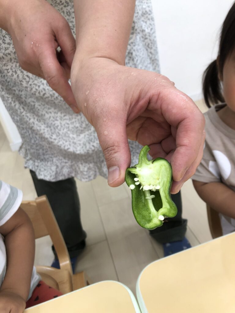 今日は、ピーマンを収穫し、調理の先生がピーマンを半分に切って見せてくれました。