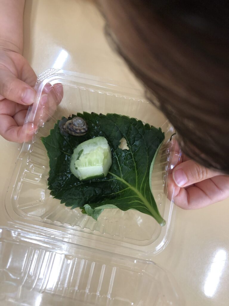 かたつむりを先生が連れてきてくれたので、たいよう組で観察しました!