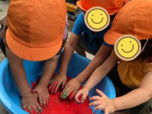 今日は片栗粉でスライムをしました。握ると固まり手を広げるとドロドロ〜っとする様子に興味津々❣️