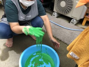 ギュッと握ると固まり手を広げるとドロドロ〜とする様子に驚きながらも楽しんでいました❣️