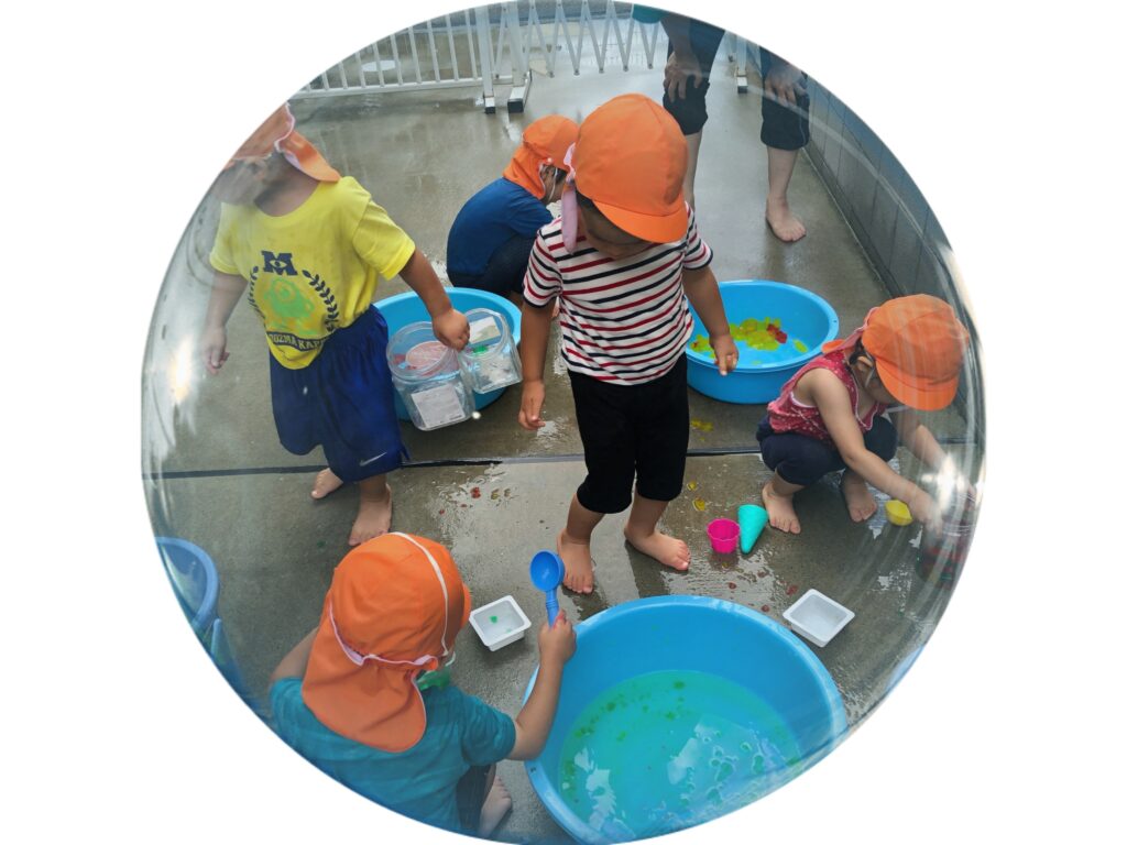 今日は、寒天ゼリーで遊びました。冷たーく冷えた寒天ゼリーに、初めはおっかなびっくりな たいよう組さんでしたが…『グシャッと握っていいんだよ!』の声かけにどんどんダイナミックに触れて遊びました! カップに入れてゼリーやプリンに見立てたり、大きい容器に入れて水を入れると…『金魚みたい!』との声も聞こえました。そして、『いらっしゃいませ〜』とお店屋さんもオープンし沢山遊びました(^^)