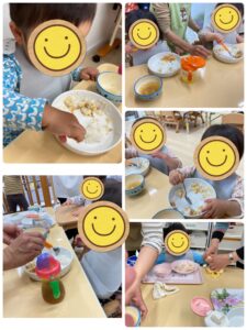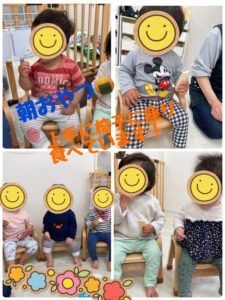朝の会はポカーンとしていますが、おやつはニコニコでカリッ!といい音をさせて食べています!