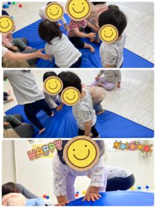 飛び石の上にマット敷いてお山が登場!初めは四つん這いで登っていましたが慣れてくると歩いて登りとても楽しそうでした♪