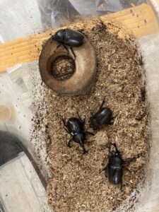 たいよう組さんも一緒に観察!おぉ!と興味津々で観察したり触っていました。全部で4匹のカブトムシがいました!大切に育てたいと思います。