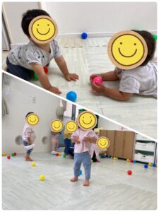 ボールや風船遊びもしました。お友だち同士の関わりも増えてきて、この日は洋服の中にボール入れ始めるみんなでした🥰