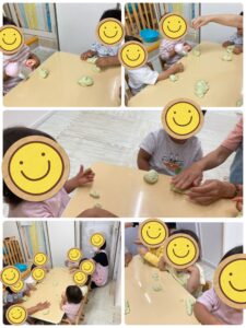 小麦粘土に挑戦しました。初めて触る子が多く、おっかなびっくりでしたが、慣れてくると握ったり、ちぎったりして遊びました。先生が、お団子やカタツムリを作ると満面の笑みでした。☺️