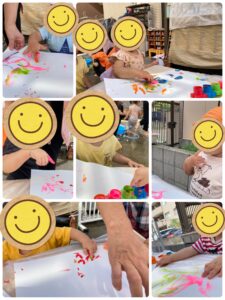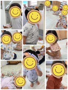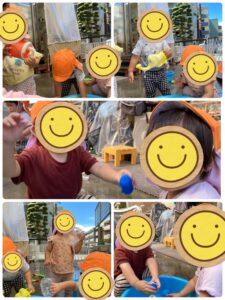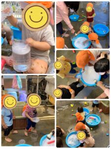 泡が登場すると拍手がおこります🥰水遊びも慣れてきてパシャパシャと口にしながらダイナミックにタライの水を叩き、水しぶきが上がると大興奮☺️顔に水がかかっても泣くお友だちは1人もいない、そら組・うみ組です☺️