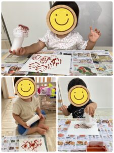 ビリビリ破き、細かくした広告をお布団にしたり、ビリ!ビリ!と言いながらケタケタ笑っていたり、細く丸め頭に被り『へい!らっしゃい』とごっこ遊びをして遊びました。