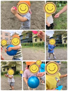 旭公園では、ボールを持っていくとラグビーボールのように抱えて走ったりサッカーのようにキックしたり…楽しそうな様子を見ていた、あんよ練習中のそら組のお友だちは、座って遊ぶよりも楽しそう!と思ったようで、トコトコと歩き出しました♪数歩進むと満面の笑みで拍手👏しながら、あんよ練習を楽しんでいましたよ。