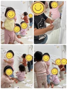 雨の日には壁に模造紙を大きく張り、シール貼りにも挑戦!