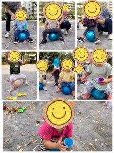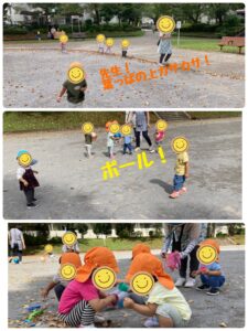 ボールを使って、キックやポーンと投げたて走ったり…落ち葉を使って、おままごとをして遊びました。秋の自然を使いながらお友達同士の関わりも増えてきて、お名前を呼び合ってケーキやアイス作りを楽しんでいました♪