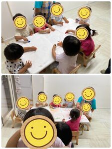 金曜日は、雨だったので室内で、ブルブルブルドックやバスにのっての音楽を流しながら体をうごかし、後半はクレヨンに挑戦!グルグルとクレヨンを上手に持ち書いていました♪クレヨンをした後はシール張りにも挑戦。
