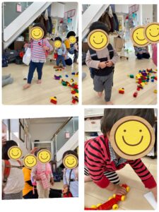 初日は、あいにくのお天気だったので室内で体操やトンネル、飛石を使って体を動かして遊びました。