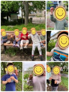 たんぽぽの綿毛を飛ばしたり、ダンゴムシやヘビイチゴ、桜の実を見つけて赤だね。緑だねと発見したことを言葉で伝えてくれるみんなです。