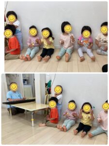 先週の火曜日に、今年度初めての音楽遊びをしました。久しぶりに会う先生に…ちょっぴり緊張気味のたいよう組さん。