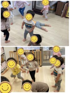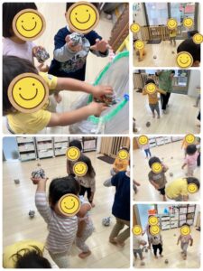 今週は運動あそびもありました。動物に変身してみたり、自分達で、広告を丸めてボールを作り、投げることを体験しました。