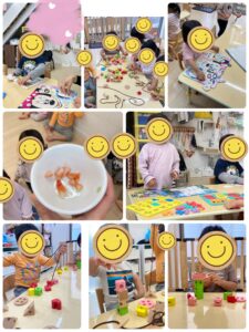 この日は、出かけようと思ったら雨が…。室内でパズルや紐通しをしました。紐通しのはずが…いつの間にか積み木遊びや魚釣りに。みんなのアイディア満載なひとときでした🥰