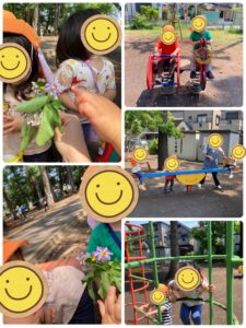 畑の横を歩きながら、『あれはじゃがいものお花だよ!』と話をしていたら、畑の方がじゃがいものお花を譲ってくれました。紫や白の綺麗なお花に目を輝かせていた たいよう組さんです!