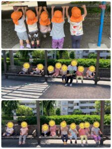 公園では自然とお友だち同士で集まって同じ遊びをしたり、虫探しをしたり。名前を呼び合ったり、優しく誘ってあげたり…。『少し休憩してくる!』と1人が言うと自然とみんなで集まって休息タイム!