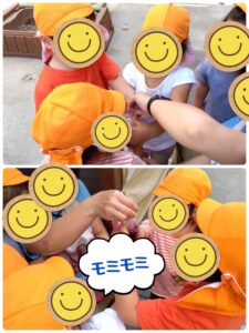 ツン!と触ったり、持ってみたり…物おじせず興味津々です。大好きな『はらぺこあおむし』の絵本のようにご飯をたくさん食べています!木曜には蛹になる準備をして皆んなは更に興奮!無事に立派な蝶々となって会えることを楽しみにしたいと思います。