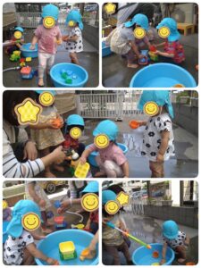 水遊びは初めてのうみ組さん。おもちゃに水を入れて渡すと、こわがりながらも遊びはじめていました!