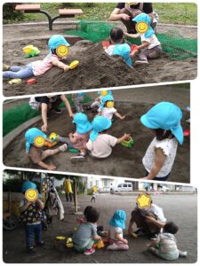 週の後半は、思ったほど気温が上がらなかったため、公園で遊ぶことができました。砂山に寝転んだり、一人ひとり集中して遊んでました☺️