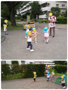 ワニさん公園での戸外遊びでは、遊具を楽しんだり、シャボン玉を追いかけたりしてました。