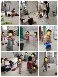 ボールや車や人形遊びなど様々な遊びを取り入れて遊んでいます。見学に来られた小さいお友だちに手を振っていたうみぐみさん。人形遊びでは、いつも以上にお世話していました☺️