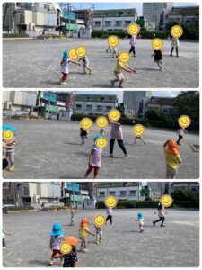 近くの公園ですが、シャボン玉や先生やお友だちと一緒においかけっこなどをしてたっぷりと体を動かして遊びました。