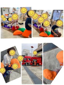 消防署へお散歩へ行くと消防士さんが点検をしていて少し見せて頂いたり、救急隊長さんにスカウト(笑)されてドキドキなたいよう組さんでした!
