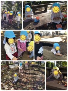 外遊びは自然物と触れ合いました。カマキリさんにも挑戦!? 築山の斜面は時々、尻もちつくけど、おもしろくて、お洋服や靴が真っ黒になることも💦