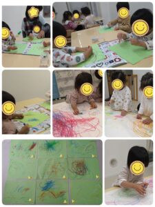 クリスマス🎄の制作でクレヨンを使いました。ぐるぐるや点々など、それぞれの個性が出ています!!小さな紙だけではつまらないので、模造紙にも書いてみました☺️
