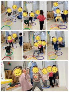 フープを使い、ケンパに挑戦!順番を守り上手に遊べました。
