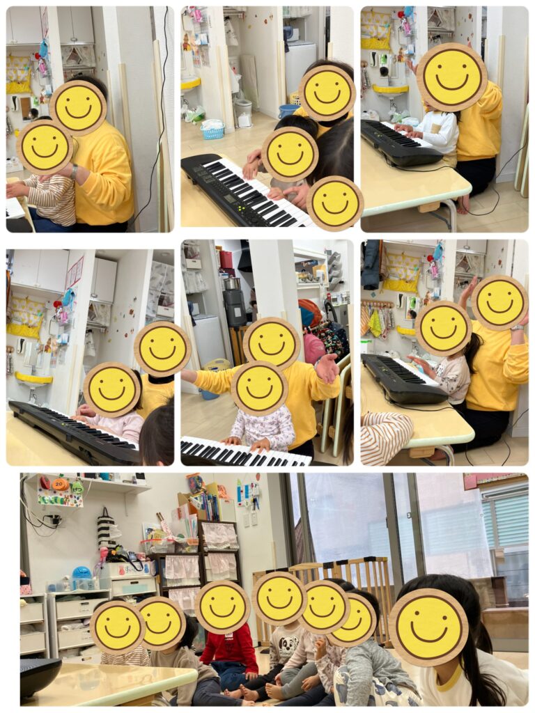 久しぶりに音楽あそびの先生が来てくださり、楽しく歌や手遊びをしたり、キーボードの音に合わせて体を動かしてあそびました。
