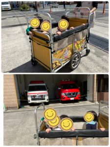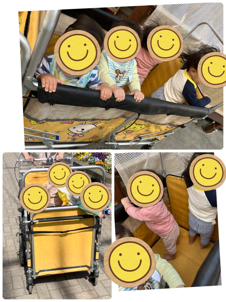 初めての散歩車にも上手に乗れ、お花やごみ収集車を見て楽しんだり…