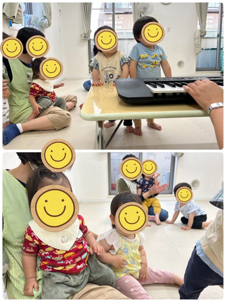 講師の先生は系列園の保育者が行ってくれます。うみ組・そら組さんにとっては初めましての先生でしたが、キーボードから出てくる素敵な音楽に体を揺らして楽しみました。
