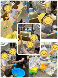 保育者から水鉄砲の使い方を教えてもらうと…あっという間にマスター✨ケタケタと楽しそうに笑いながら水鉄砲をシュッと楽しみました。