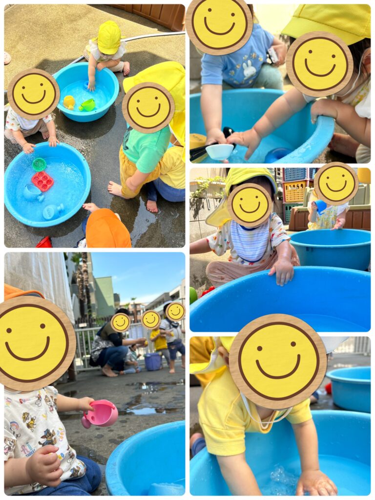 おはなでは、テラスでタライにお湯を入れて遊びます😊