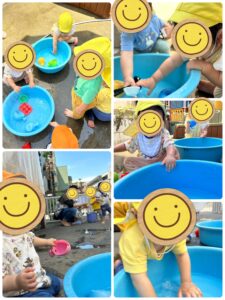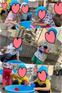 水遊びでは、カップやじょうろに水を入れて「ご飯作ってるの!」「ジュースでーす!」とお料理上手なたいよう組さん☺️