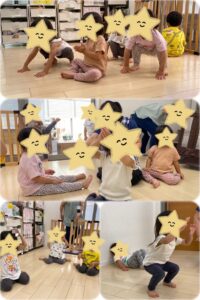 音楽遊びでは、ピアノのリズムに合わせて「大きな栗の木の下で」や「ミッキーマウスマーチ」、「おつかいありさん」等色々な曲で体を動かして楽しんでいましたよ😊