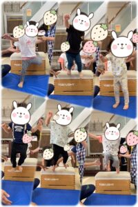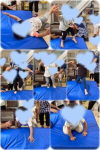 運動遊びでは、マットの下に隠された跳び箱に登ってジャンプ!!