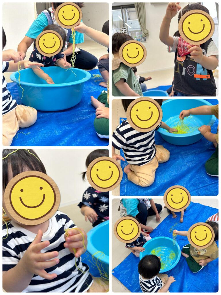春雨と寒天ゼリーを冷蔵庫で冷やしておいたのを出すと…はじめは、遠慮がちだった そら・うみ組さん☺️保育者が触っていると次々と触って楽しむことができました。髪の毛にまで乗せてみたり…ギュッとにぎったり、楽しい時間を過ごせました♪
