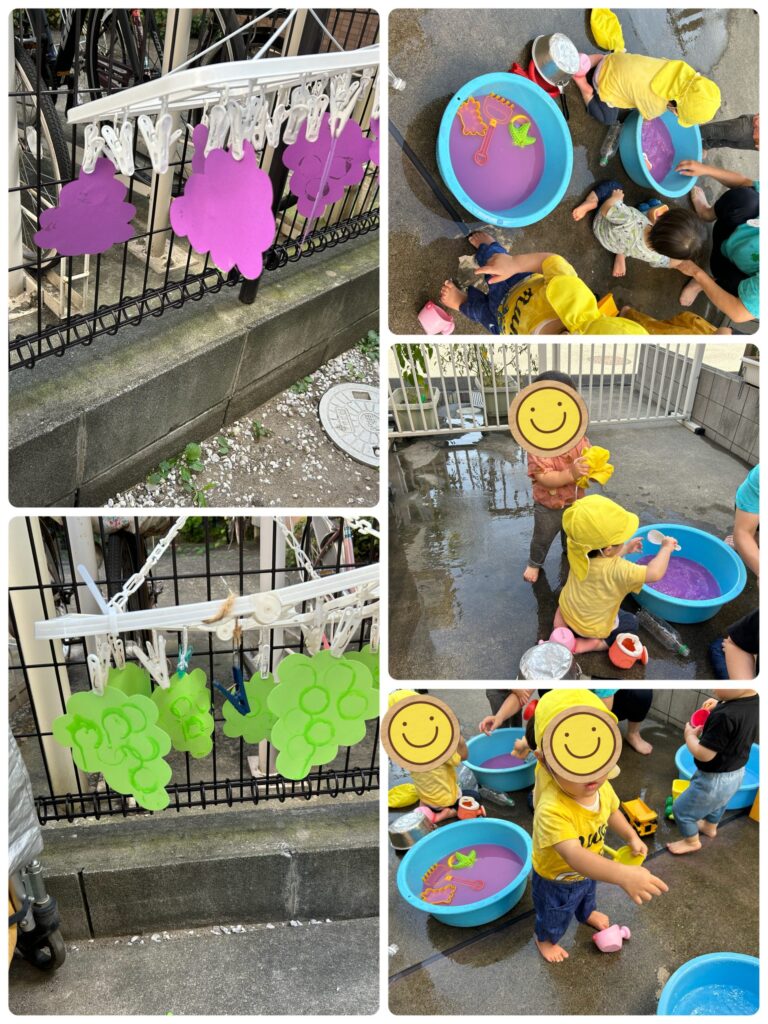 初めての絵の具だったので、どんな反応かなぁ…?と思いましたが、小さなペットボトル片手にスタンプ遊びをしたり、その絵の具を使って色水をして楽しみました。