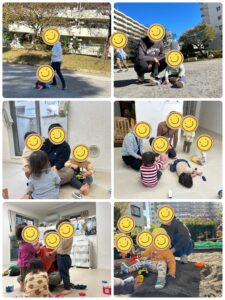 今年はお天気が悪い日もありましたが、室内でクリスマス制作をしたり滑り台で遊んだり、お天気のいい日は広い広場へ行ってボールをしたり、砂遊びを楽しみました。