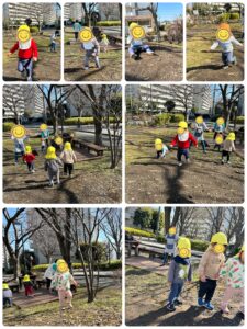 散歩車無しで お友だちや保育者と手をつなぎ歩くことも頑張っています。