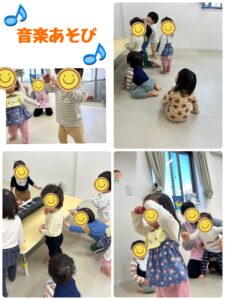 今年度最後の音楽あそびを先日しました。まだ歩けなかったり、つかまり立ちをしていたみんなが3月の音楽あそびでは全身でキーボードのリズムに合わせ体を動かして楽しんでいました。