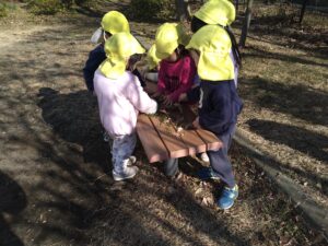 友だちと一緒にごっこ遊びもしてますよ。切り株やベンチはキッチンに変身。みんなで料理して、「いただきます!」と手を合わせて食べます!!