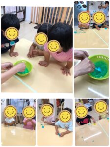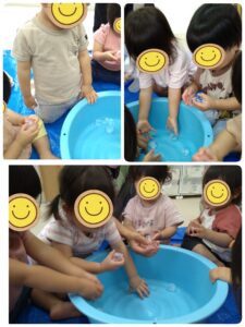 触ってみると、「つめたい」と言ってすぐ手放してしまったり、その反対でずっと手に握りしめ、溶けた氷で、お洋服が濡れてしまったお友だちも…。氷に触れ、少しだけ、涼しくなったような気がしました。