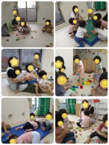 室内遊びは、身体を使ったり、ふれあい遊びをしたり、さまざまでした。最近では集中力もついてきて、夢中になって遊んでいます。
